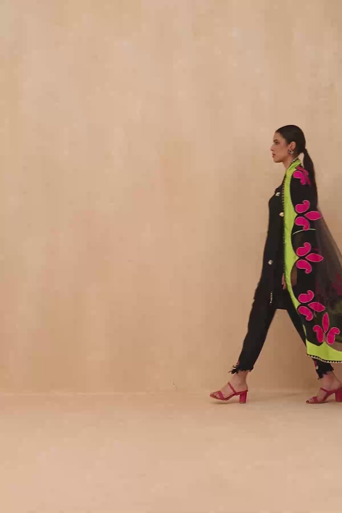 Black summer silk kurta with bif flower sequin embroidery, tassel work on pants and bright patch work on dupatta