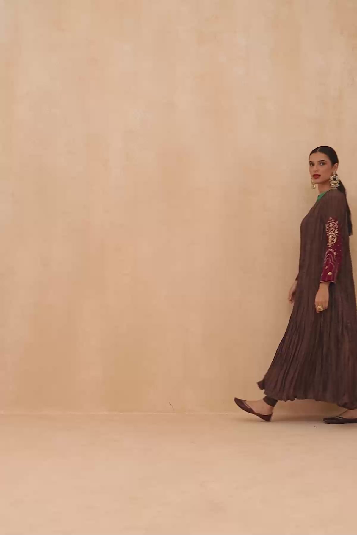 Brown summer silk crinkled kurta with purple and green patch work with hand embroidery
