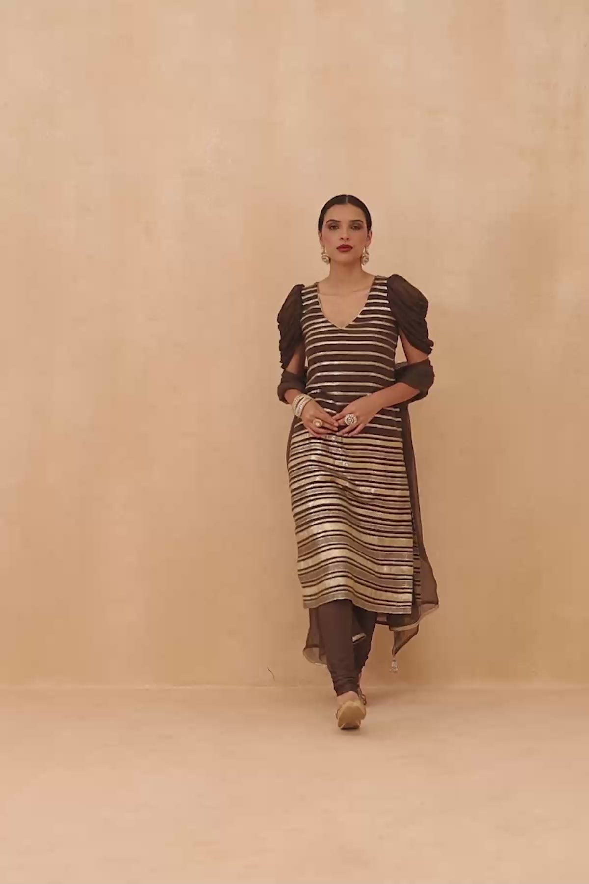 Brown georgette kurta with foil work , chiffon cown sleeves and dupatta , paired with lycra pajami