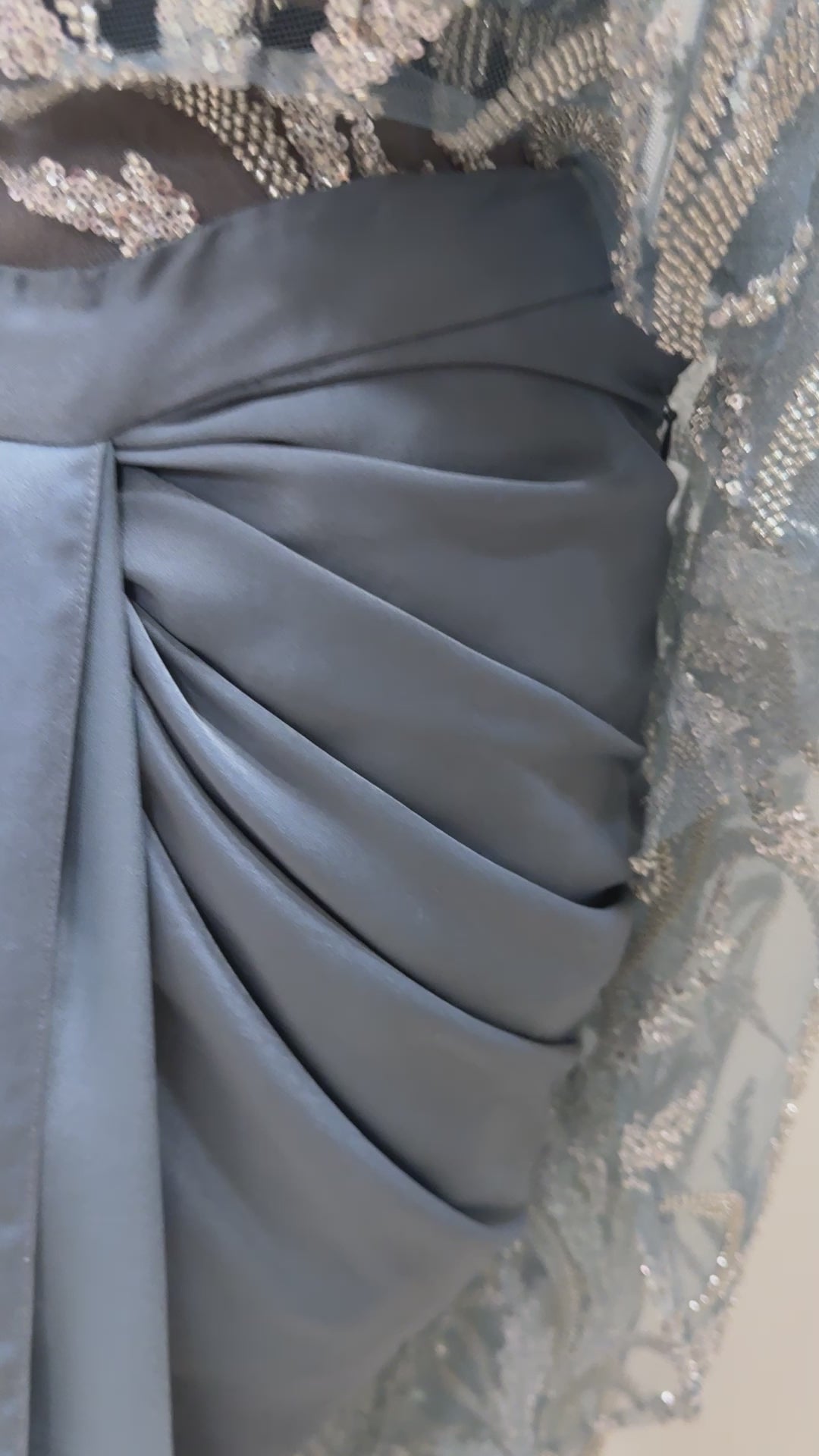 Blue imported satin draped saree with embroidered corset blouse and palla