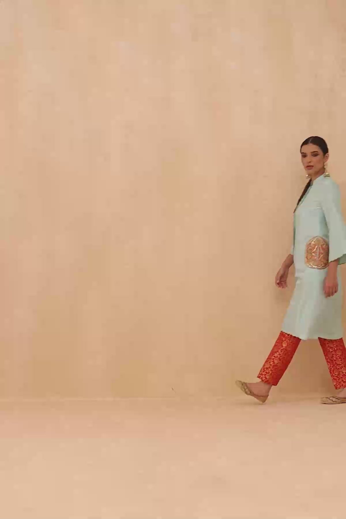 Cyan summer silk jacket kurta with orange brocade pants and embroidery on pocket patch