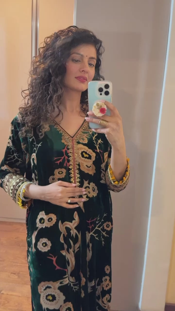 Green brasso velvet kurta set with hand embroidery on neck and sleeves and pants