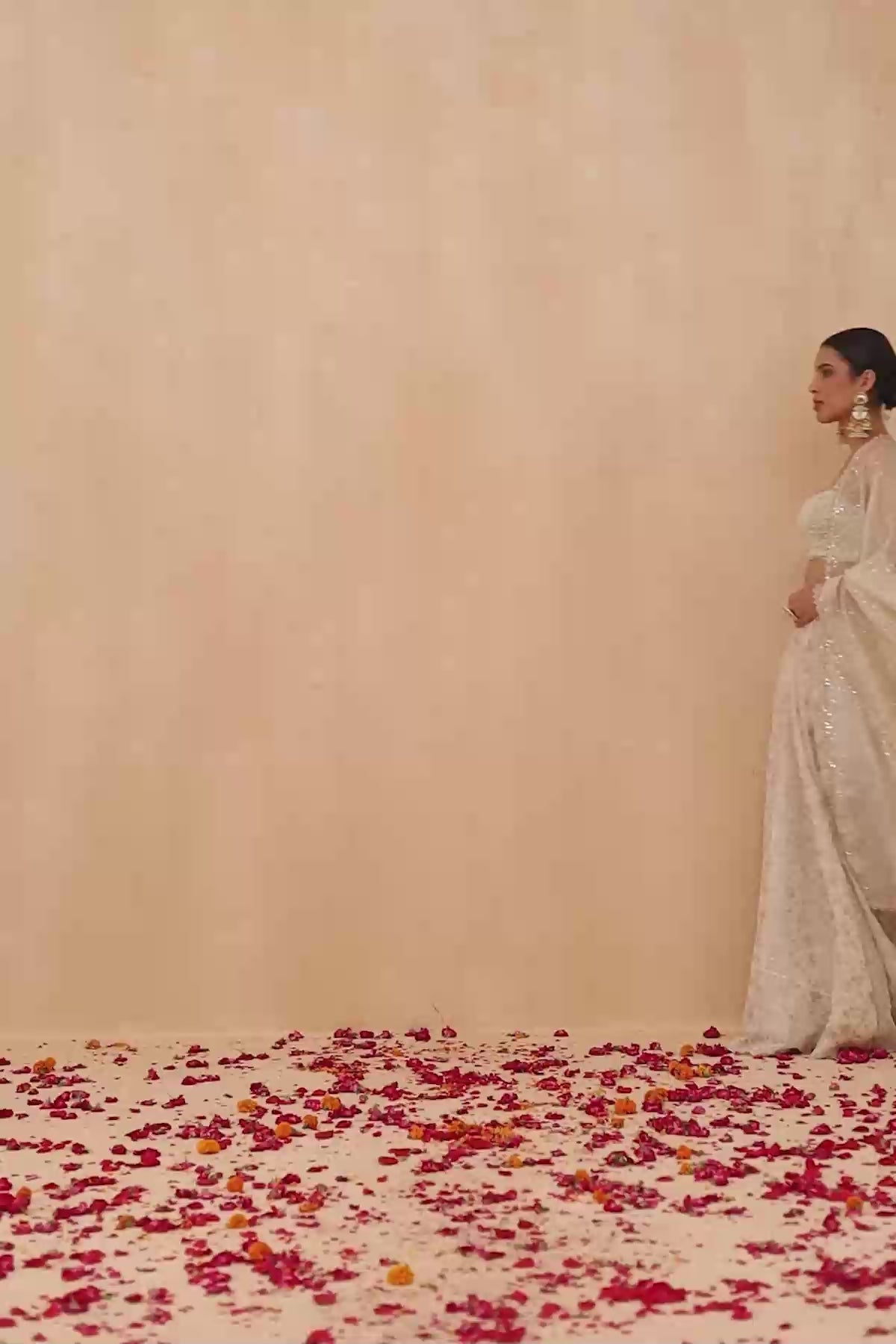 Ivory chanderi lehenga with aari embroidery, hand embroidered corset blouse and organza mukaish dupatta