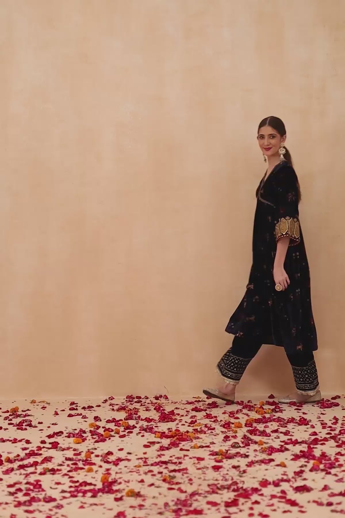 Blue printed velvet shirt with palazzo pants with hand embroidery